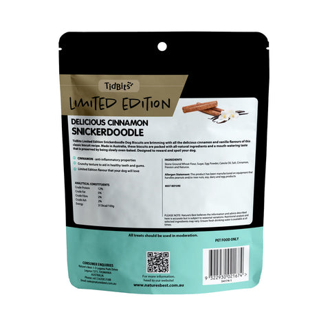 TidBits Limited Edition Snickerdoodle Dog Biscuits are brimming with all the delicious cinnamon and vanilla flavours of this classic favourite recipe. Made in Australia, these biscuits are packed with all-natural ingredients and mouth-watering taste that is preserved by being slowly oven-baked. Designed to reward and spoil your dog.