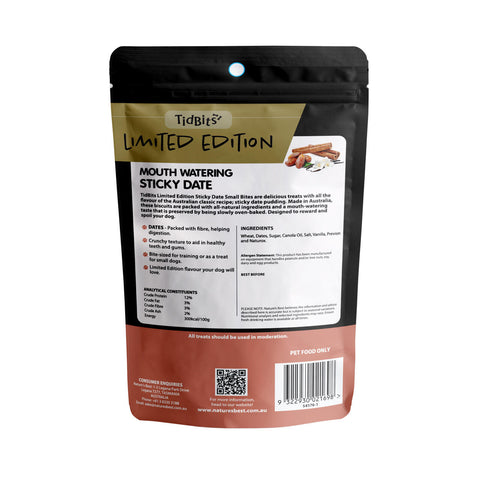 TidBits Limited Edition Sticky Date Small Bites are delicious treats with all the deliciousness of the Australian classic recipe; sticky date pudding. Made in Australia, these biscuits are packed with all-natural ingredients and mouth-watering taste that is preserved by being slowly oven-baked. Designed to reward and spoil your dog.